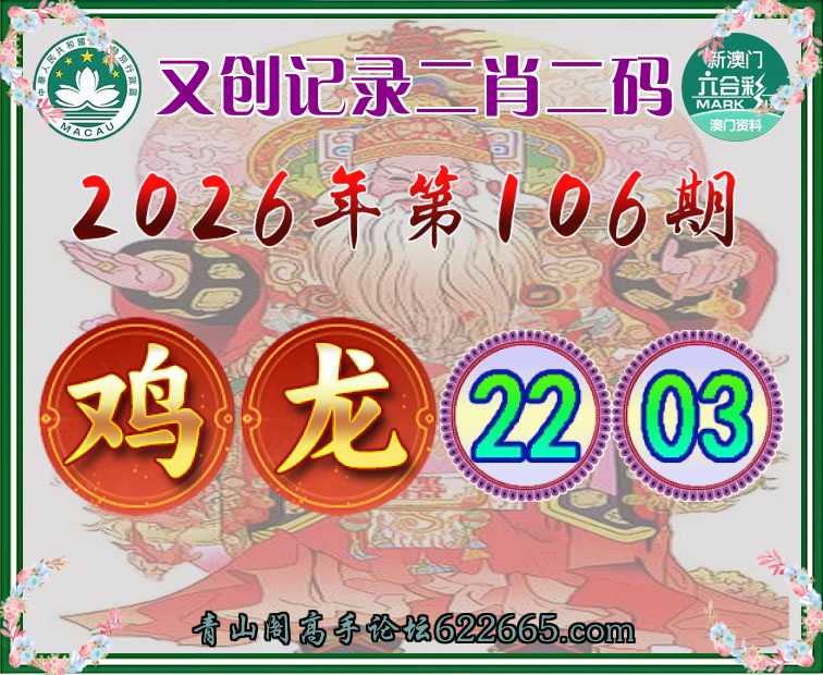 106期: 🥩《又创记录》 🥩二肖二码🥩【龙】【22.03】开:鸡22准上榜高手